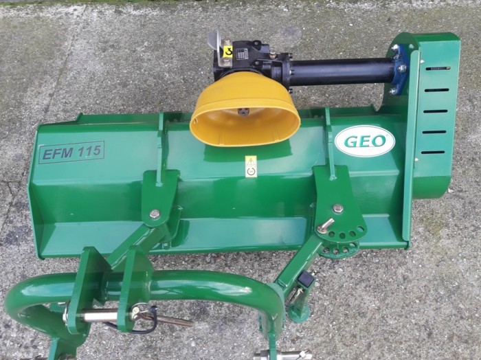 Trincia Geo a mazze efm 115 di lavorazione grande spostamento meccanico, con gruppo a ruota libera Comer slitte e rullo regolabili adatto per erba e potatura fino 3 cm peso kg 240 completo di giunto cardano.